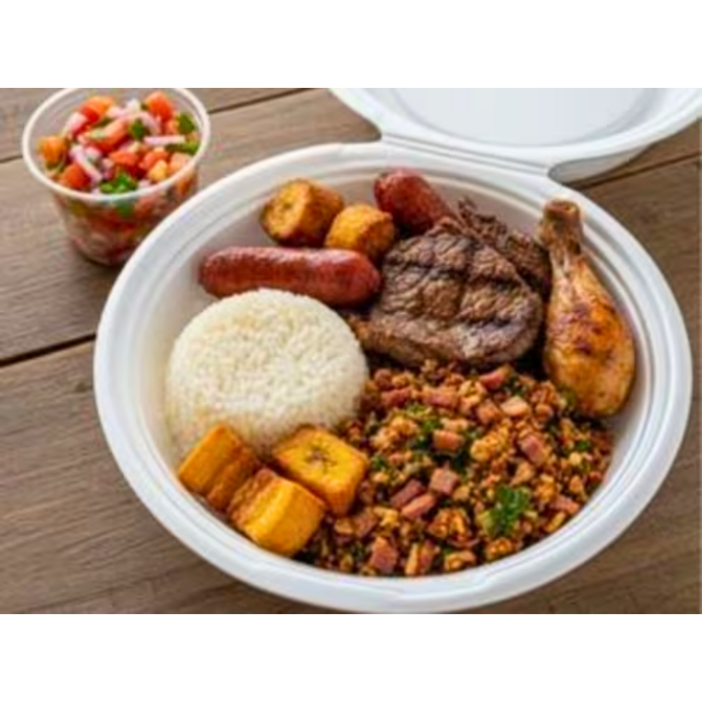 Feijão Tropeiro com Frango, Linguiça e PernilNovidade da Casa, Delicioso Feijão Tropeiro com Churrasco de Frango, Linguiça e Pernil Assado na Churrasqueira, Arroz Quentinho, Tropeiro Fresquinho rechegado de Calabresa, Torresmo Famosa Banana a Milanesa, Salada de Vinagrete pra Acompanhar.R$ 41,90