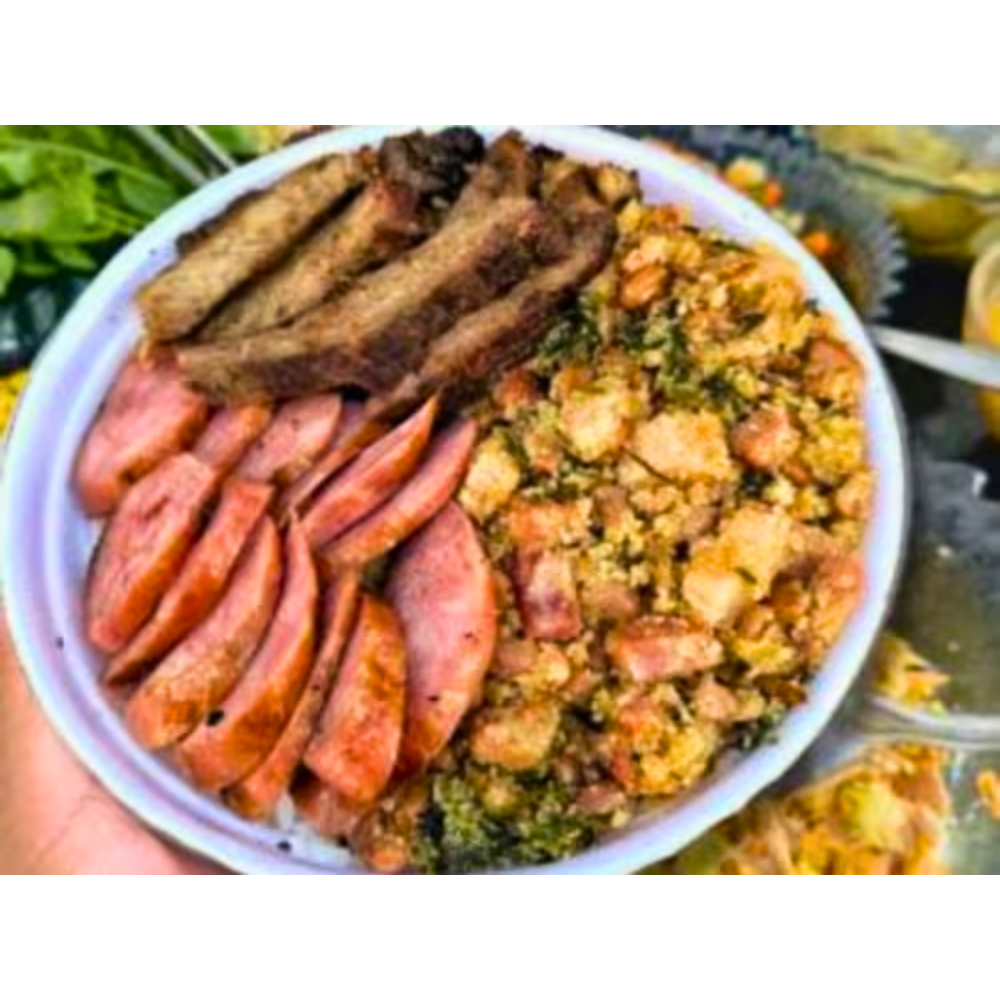 Tropeiro com Carne Assada e Mandioca Frita marmita GCombinação perfeita, Arroz quentinho, Feijão Tropeiro, Contra Filé Assado na Churrasqueira, Mandioca Frita na Hora, Torresmo.R$ 43,90